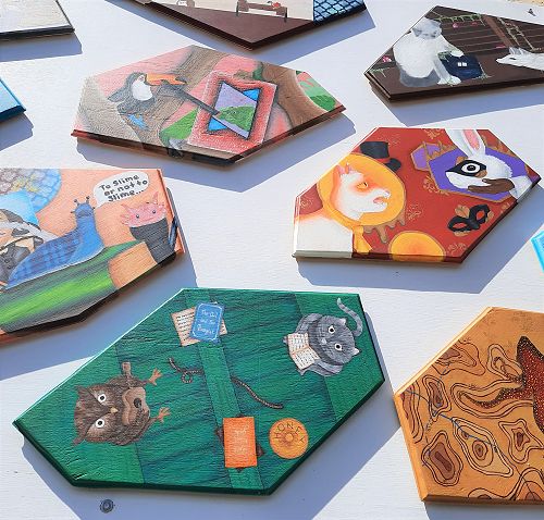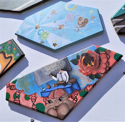 And so, with these two factors, we created the theme of ‘In the classroom’ to aid in creating related murals that were not difficult to integrate into our work. We all chose different subjects - Science, English, Math and many more! We used a variety of animals in our paintings, which added an odd and interesting twist to our murals and suggested the diversity within our school. The individual murals were grouped together in the style of NZ artist Richard Killeen and then stuck down on two panels to create two collaborative murals.