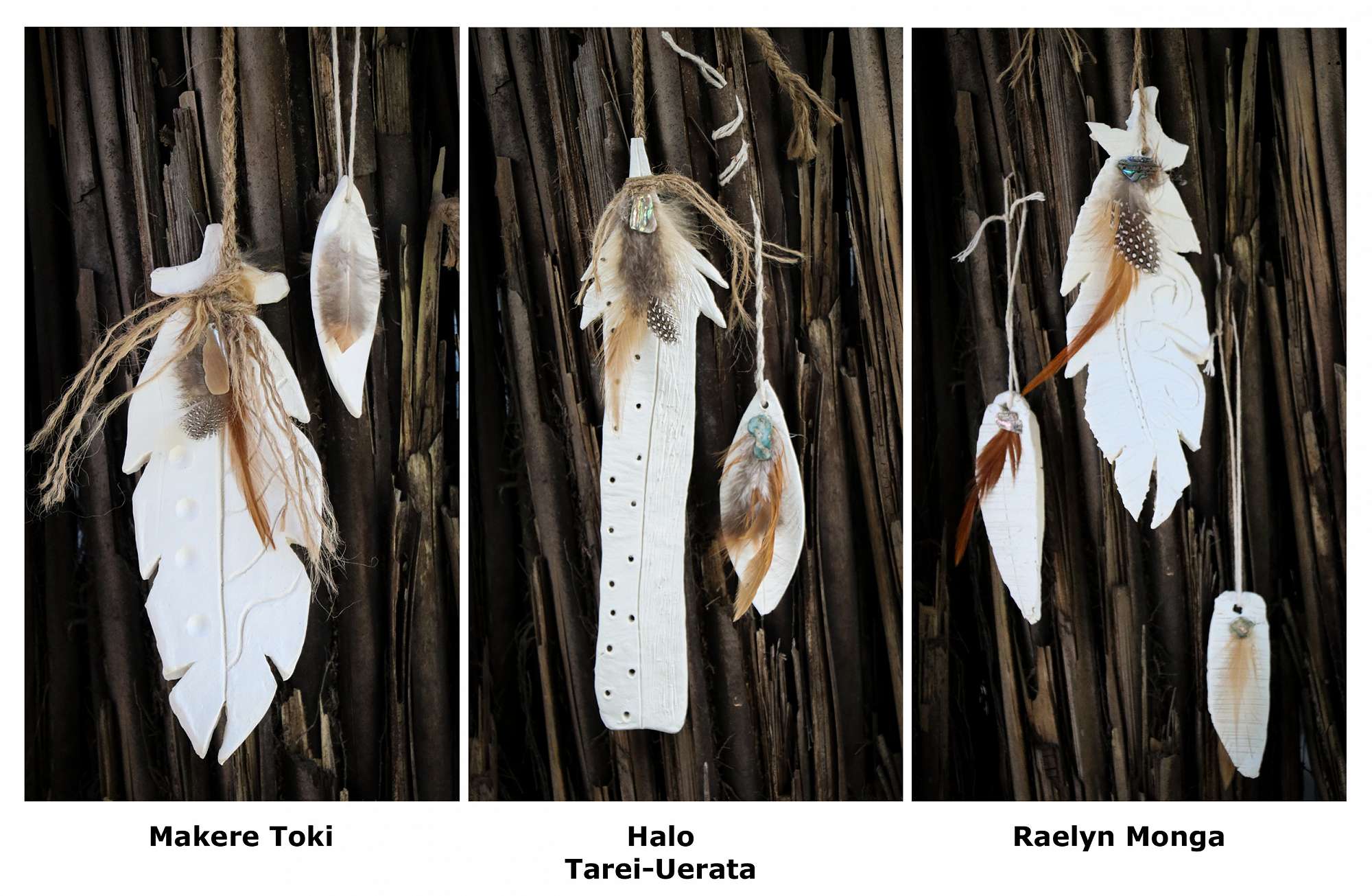 These are our huruhuru sculptures that we crafted out of clay, paua shell, feather and twine.