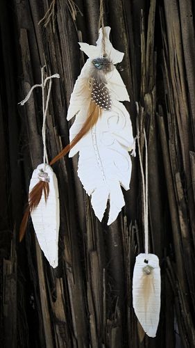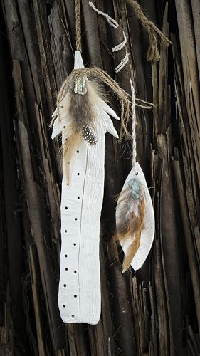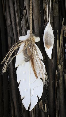 We used clay tools to shape, cut, form, make marks, cut holes and then left this to dry naturally. We then attached the feathers and paua and bound with twine to suspend them. When they are hanging and spin around you can see the beautiful detail on both sides
