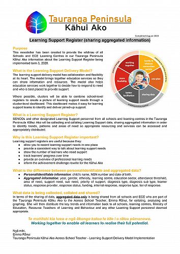 Kia ora whānau. As one of 15 schools involved in the Tauranga Peninsular Kāhui Ako, we have been working on developing a collective learning support register. This is a collection of specific learning needs to support students at TGC. The collective register will allow us to share information which enables the community of schools to identify trends in needs for the students within our community. No personal or identifiable information about students will be shared. By identifying these trends we are better able to ensure our Kāhui Ako team are accessing the best possible support for our students. If you would like to find more information, please read the pānui attached below.