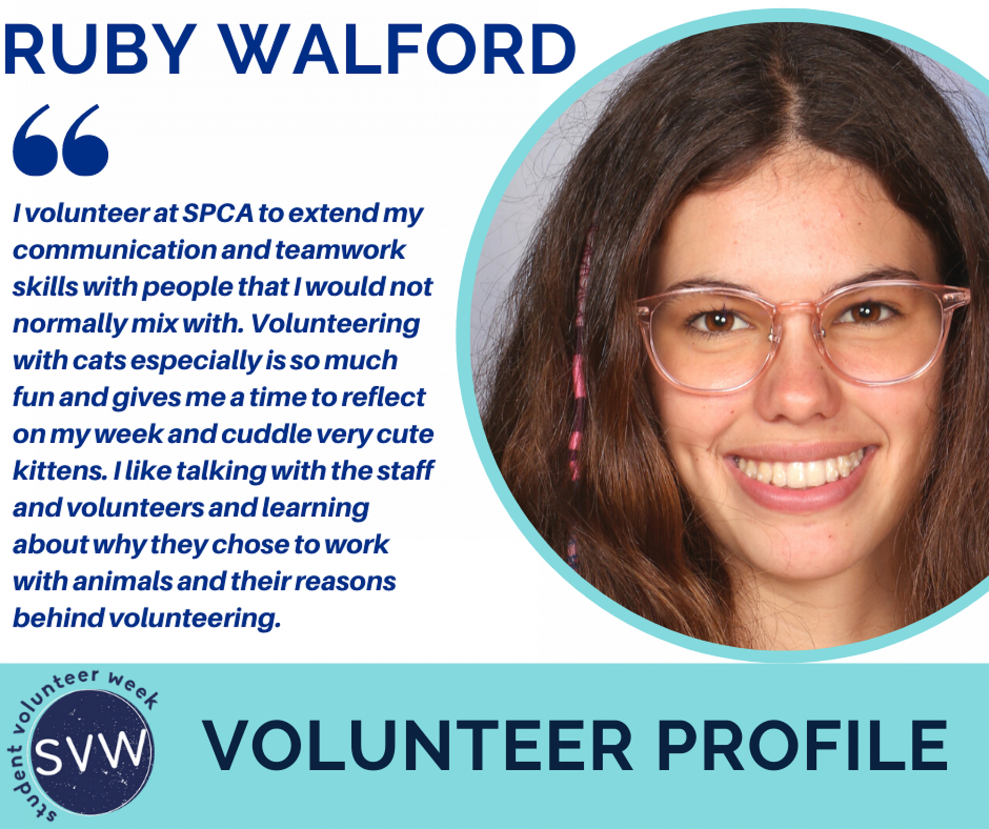 Year 12 Batten student Ruby Walford volunteers fortnightly at the SPCA Tauranga Centre working with the cats. Ruby applied for a volunteering role through the SPCA website last year and started volunteering during the summer holidays.