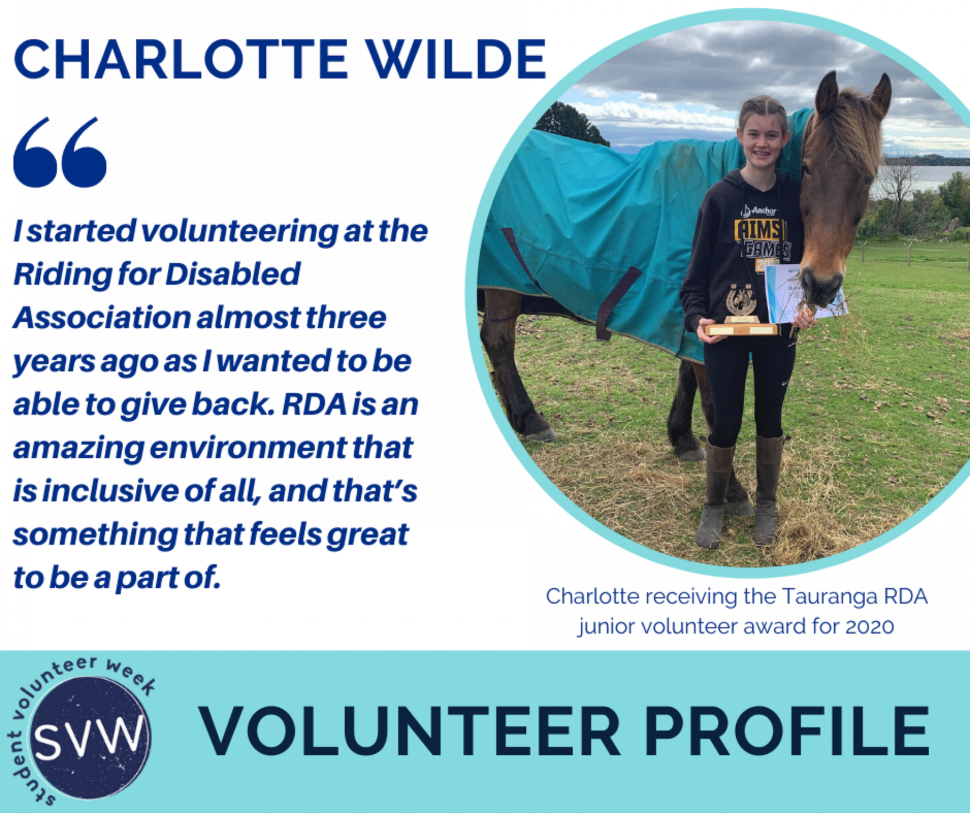 Year 11 student Charlotte Wilde volunteers for Tauranga RDA Equestrian Therapy Centre. She enjoys giving back and being involved in this inclusive environment.