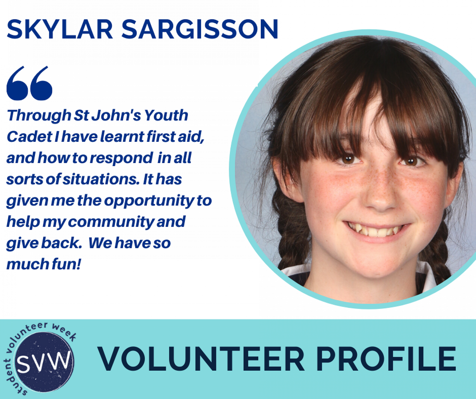 Year 9 student Skylar Sargisson volunteers for St John Ambulance through their cadet programme. She loves the practical life skills it has taught her to cope in different situations. If you want to join, you can come along to the St John building by the Historic Village on Wednesdays at 6pm.