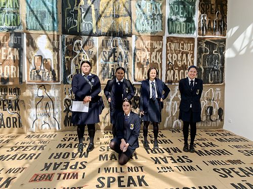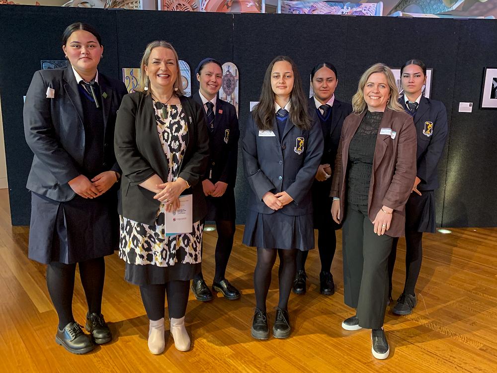 This experience was one to be celebrated with their work on prominent display at Te Papa Rongomaraeroa Te Marae. Hon Jan Tinetti opened the exhibition and then spent time talking with the girls about their artwork.