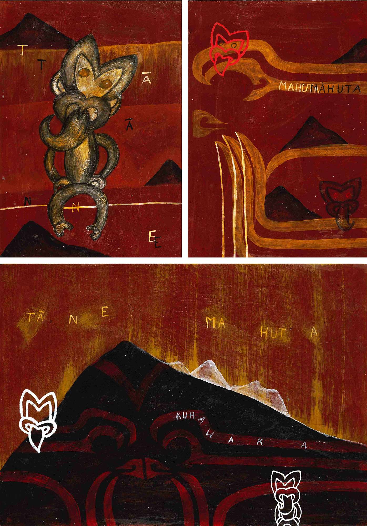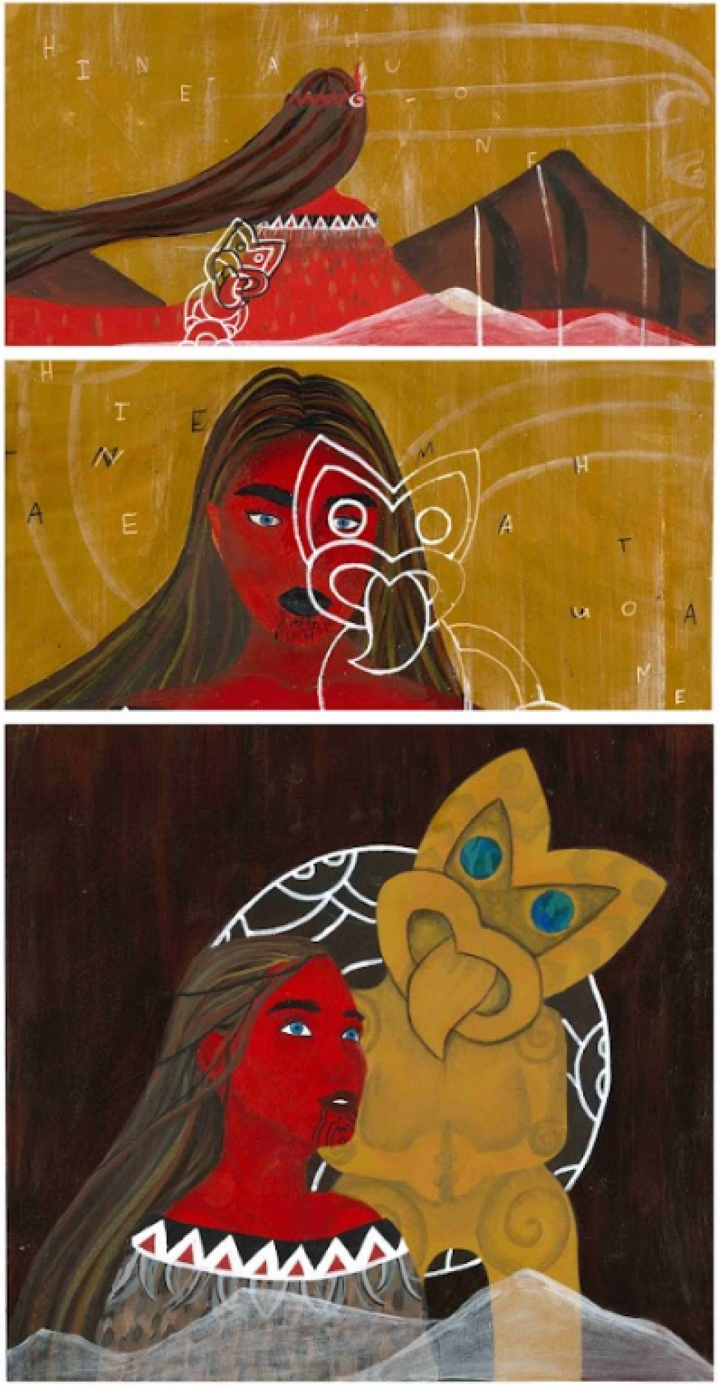 I am currently working towards completing my Level 3 Contemporary Māori Art portfolio board. The theme that I have chosen to work with this year is the legend of Hine-ahu-one. This legend tells the story of Tāne Mahuta who molds a Māori woman, Hine-ahu-one, from the red earth clay of Kurawaka and together they have the first human baby named Hine- titama. When Hine-titama grows older she has children with Tāne Mahuta unaware that he is her Father, she later comes curious of where her Father is and Tāne Mahuta tells her to ask the four walls of the wharenui as they hold all the secrets. Here she learns that Tāne is her father. After gaining this knowledge out of outrage she changes her name to Hine-nui-te-pō and leaves all of her children behind to travel to the underworld where she waits for them to return to her again. This series is the first 3 pieces of art on my folio board and are a representation of Tāne Mahuta and the land from which he later carved Hine-titama. I have used three main colours; dark red to suggest the red clay of Kurawaka, black to symbolise the still land without human life and white to represent the coming to life of the earth. In my first piece I have the moko of Tāne painted of his face with small mountains amongst the lines, this is to show that he was part of the earth. In the next piece he is represented as a taniwha to show that he could also have a more human-like form. Throughout all three pieces there are various representations to show his many forms.