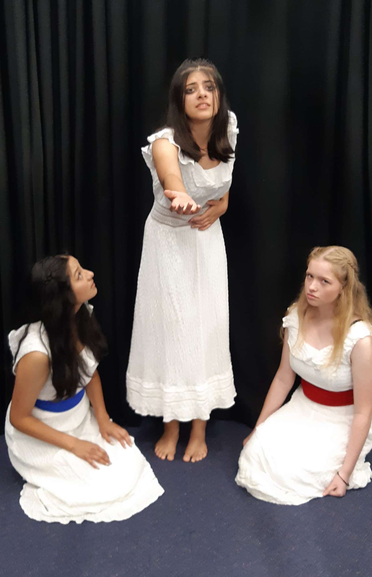 Year 12 students Alymayu Ramirez Lema, Inaya Sinclair and Talia MacKinnon wanted to create a piece that was fresh and innovative. After working with Red Leap Theatre in Year 11, they knew the impact and creativity that physical theatre inspired. So, they decided to think outside the square and move away from a traditional scene. Using Ophelia’s final speeches, they developed striking movement sequences, soundscapes and chorus of voice that conveyed Ophelia’s descent into madness. The girls' creative and critical thinking skills were rewarded and they produced a highly sophisticated piece of theatre.