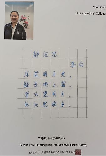 Yixin Guo was awarded Second Prize in Hard Pen, Native category;