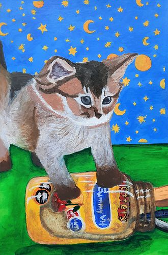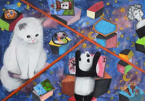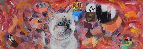 "My painting is part of the class mural. I chose to paint a cat and a panda because they are cute and sometimes my friends and my family compare me to a cat because I like to be quiet like a cat that likes to sleep all the time. I chose the colours because I wanted a colourful image that is pleasing to the eye. I enjoy drawing cat eyes because it is a difficult and challenging task to make them look nice and I enjoyed painting the little details of art objects into the picture. When I picked a cat some people thought it would be easy to paint, but when I tried to paint it, it was actually very difficult painting all the little details of the fur”.