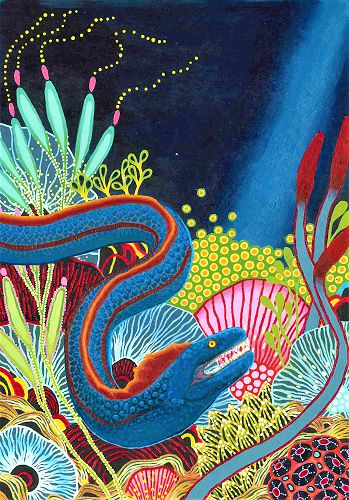 Due to my fondness for serpentine and aquatic creatures, I portrayed the Bakunawa as a giant eel-like creature. The red fin, blue scales, and yellow eyes of the Bakunawa all allude to the primary colours of the Philippine flag. The red above the blue on the serpent relates to the Philippine flag during times of war, as the Bakunawa is portrayed as an aggressive and hostile creature.