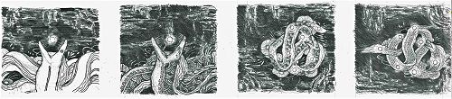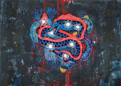 These paintings are inspired by a story of Philippine mythology; The Bakunawa and The Seven Moons. According to the legend, there used to be seven moons, but a serpentine monster ate six of them. The serpent is called the Bakunawa, and it was stopped by the god Bathala before it could eat the last moon.