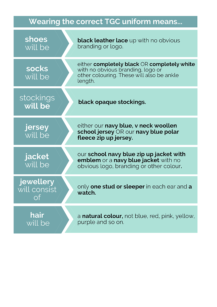 Please support your young person by making sure they are wearing the correct uniform items to and from kura. Helping them in this way reinforces our values of mana motuhake and manaakitanga and of our shared commitment to the standards we value. It also supports positive conversations about being part of 'Team TGC.’