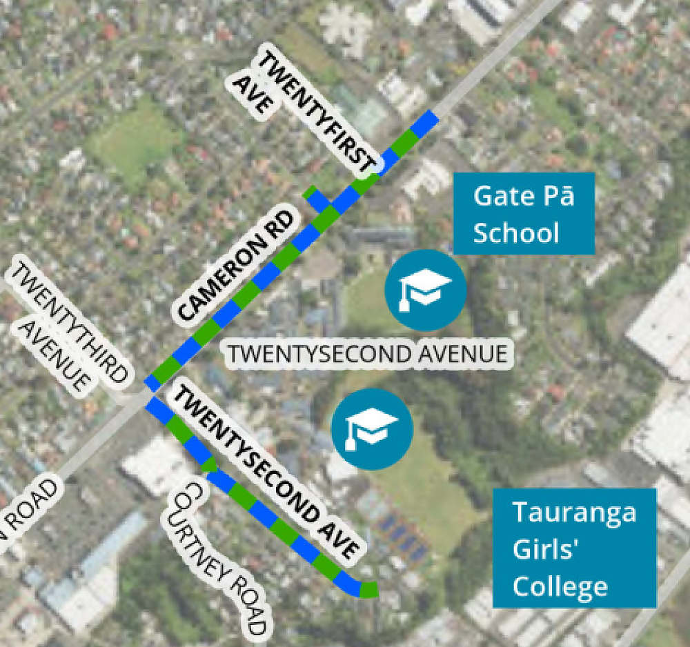 The 40km/h variable schools’ speed zone will include in entirety or parts of Cameron Road and Twenty Second Avenue (as indicated on the map below).