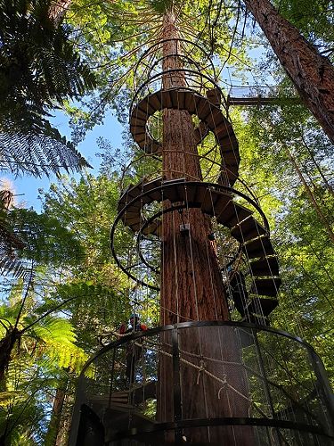 The group could choose between the Tree Top walk or the Altitude Walk. The Tree Top walk consisted of a 700m walk suspended 20m high amongst trees as old as 118 years, accessible by 28 swing bridges suspended over the native fauna and sweeping silver ferns. The more adventurous group chose the Altitude Walk, which is 650m long, with 25 bridges, 3 flying foxes, 2 spirals and suspended 25m high.