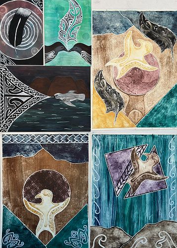 This is my toi matatuhi (intaglio print) from a collection of artworks that personify the theme of Te Haerenga ō Te Manu. This piece depicts the connection of the call between the Karere (Marsh Crake), which traditionally was used by ancient Māori to predict good or bad luck. I was inspired by New Zealand artist Robin Slow, who portrays beautiful art in intriguing ways. Partaking in Contemporary Māori Art allows me to convey my feelings in a different form and develop newfound skills within Te Ao Māori.