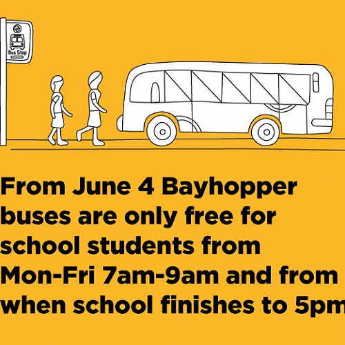 From 04 June 2022, Bayhopper buses will be free for students from 7am - 9am and from when school finishes until 5pm, Monday to Friday. Students can no longer travel on the bus for free at the weekends.