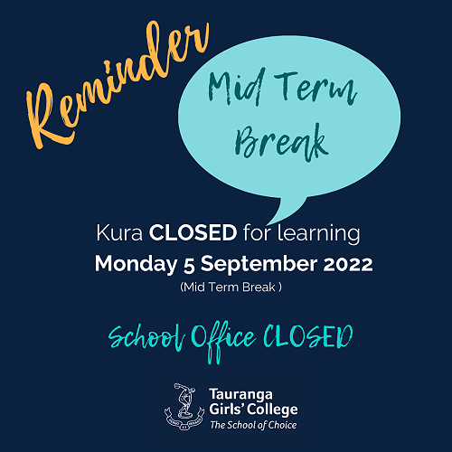 - Monday 5 Sept - Mid Term Break (Kura Closed)