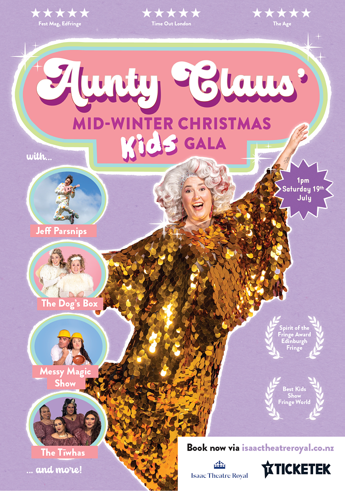 On Saturday 19 July, join Aunty Claus (Santa’s Big Sister) for a merry Mid-Winter Christmas Kids Variety Gala. This fabulous cabaret extravaganza promises to warm your heart and tickle your funny bone. In collaboration with the Isaac Theatre Royal, the multi-award-winning Tessa Waters, the “Undisputed Queen of Stupidity” (TimeOut London), leads this rollercoaster of fun, featuring the best in comedy, cabaret, circus, and drag the country has to offer.