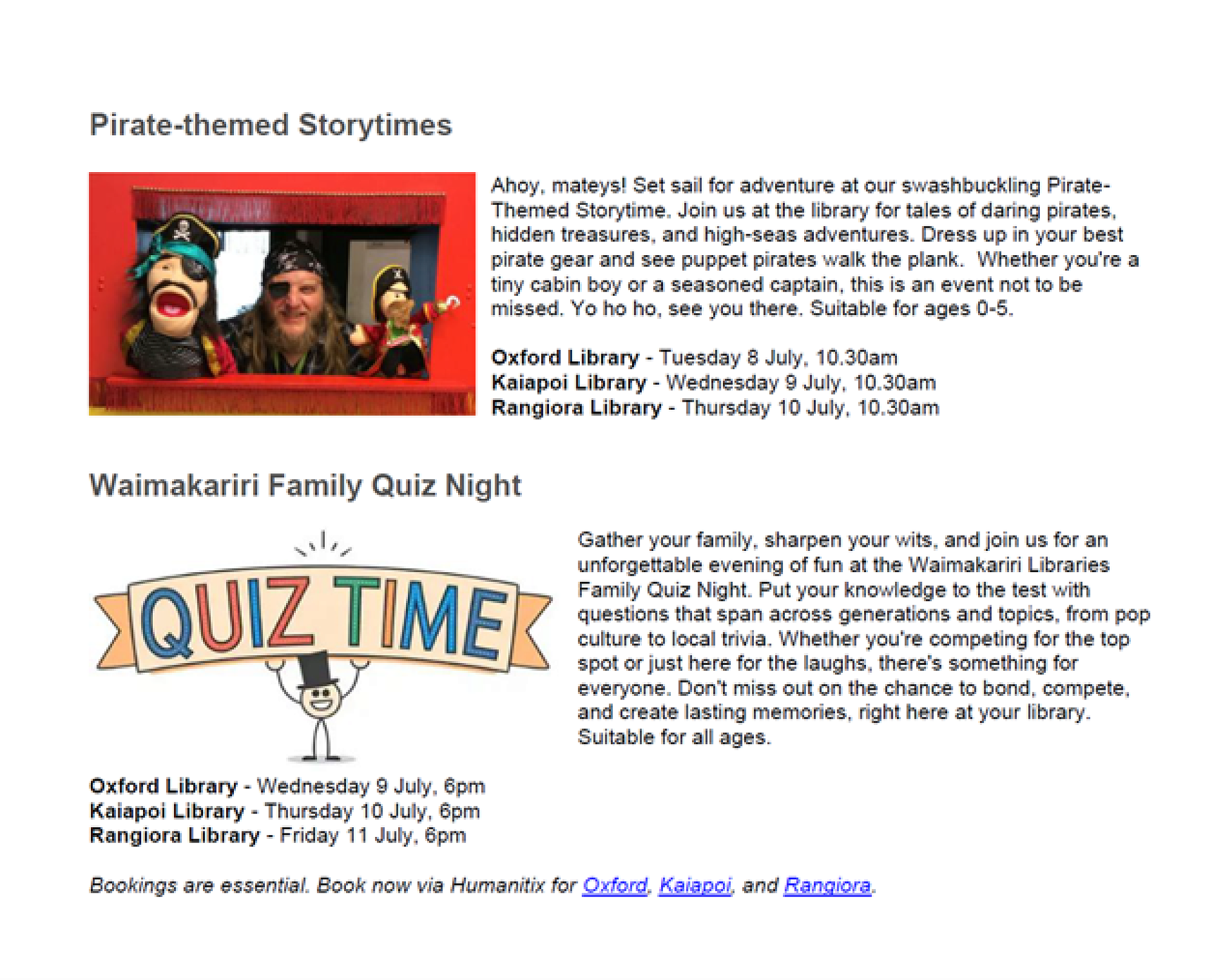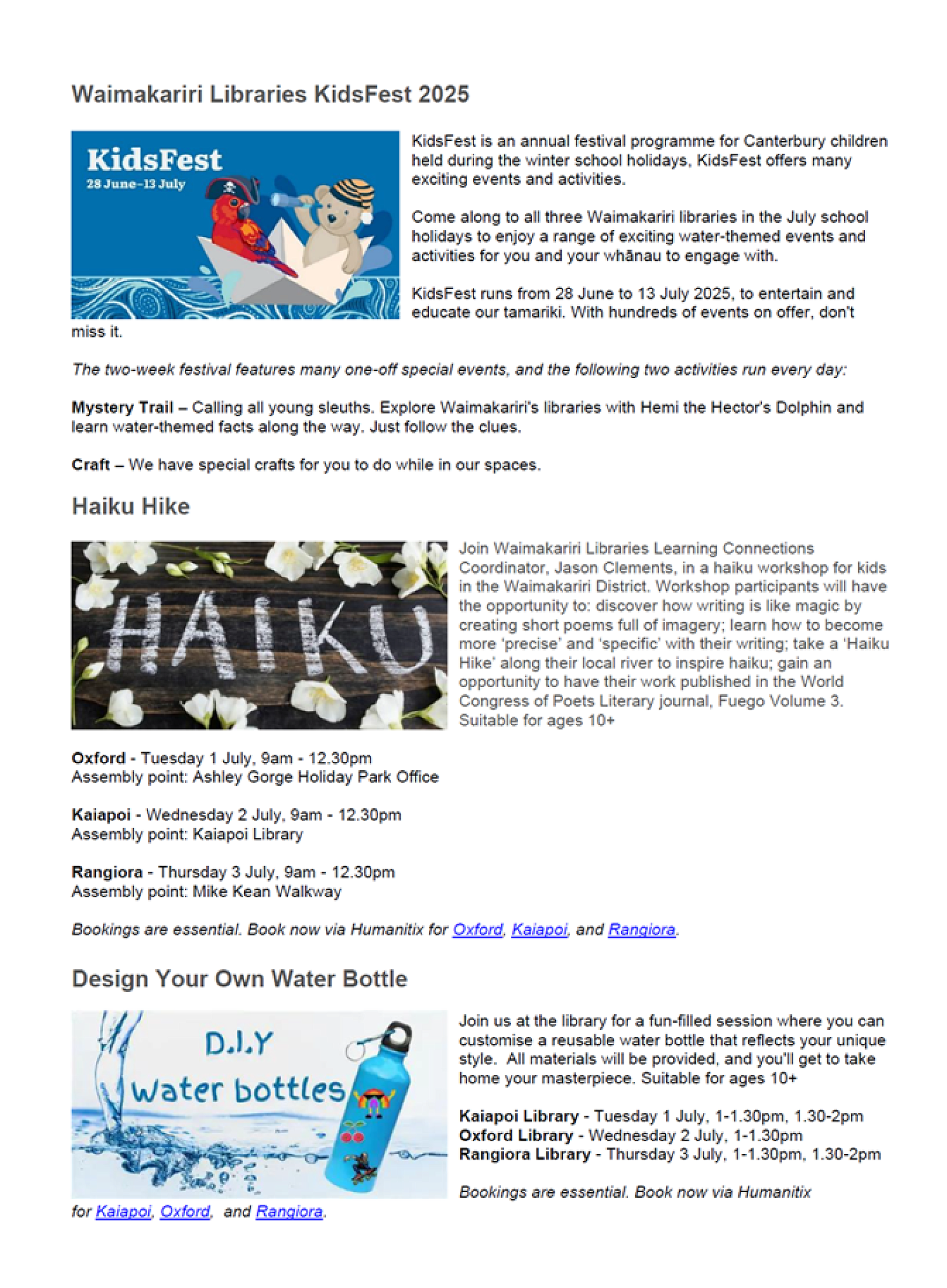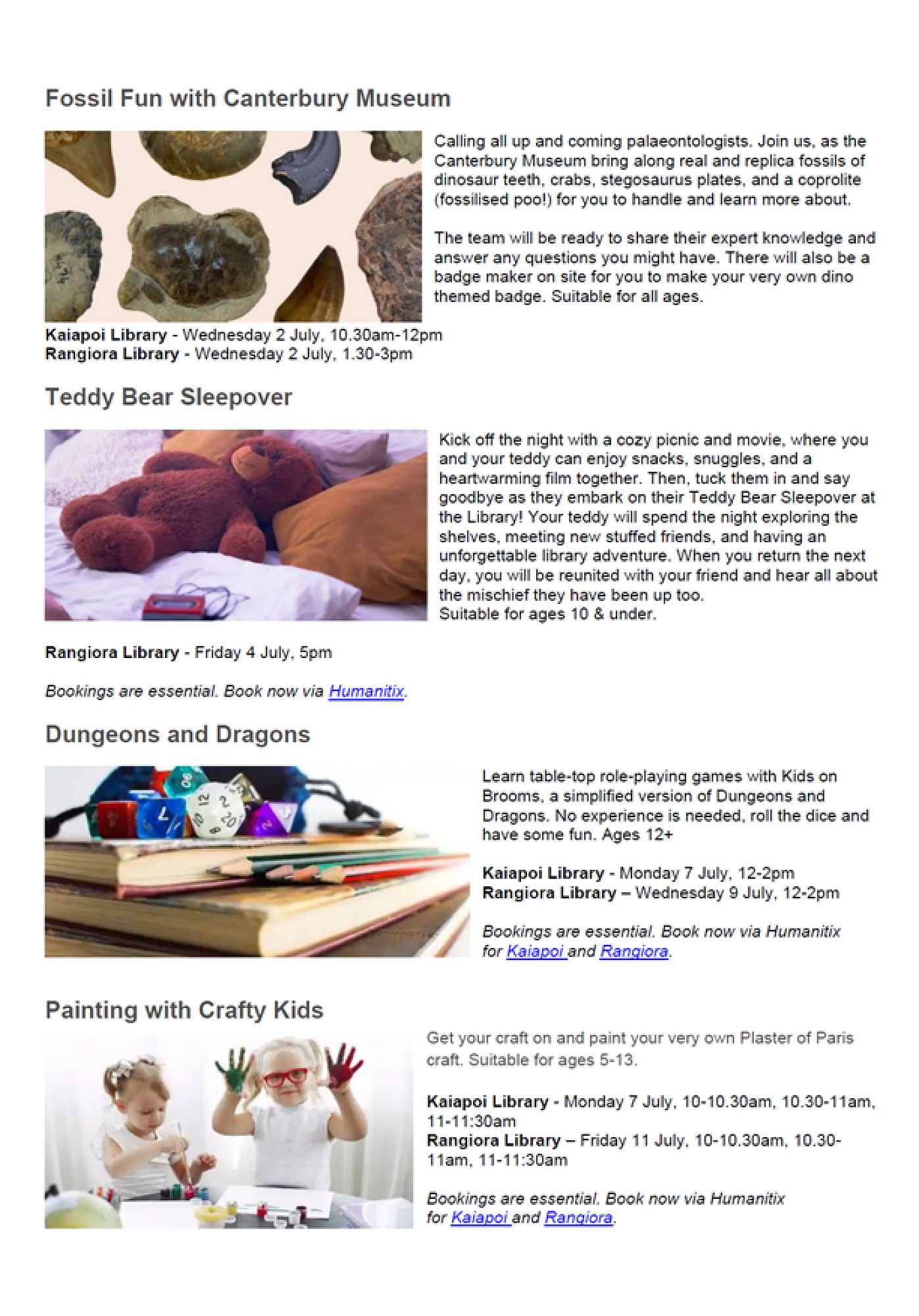 Waimakariri Libraries are delighted to offer fun for the whole family in the July School Holidays, and interactive learning opportunities for Term 3 2025.