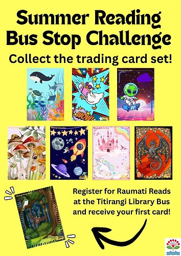 Our team have come up with a collection of exclusive trading cards for kids to collect when they pop on the bus, do one of our bus stop challenges or share what they’ve been doing and reading over the summer break. Kids do not have to have signed up to Raumati Reads to collect cards.