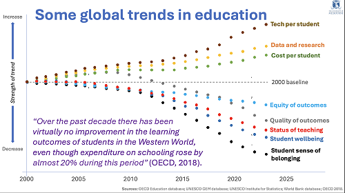 Over the past 15 years there has been virtually no improvement in the learning outcomes of students in the OECD countries - this period encompasses the time of National Standards - a change that saw no improvement in student achievement in NZ - despite promises. A time of "standards" in reading, writing and maths and of talk of national testing - sound familiar?
