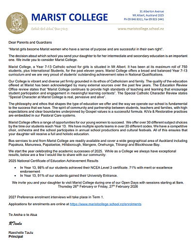 Marist College, a year 7-13 Catholic school for girls is situated in Mt Albert and has a maximum roll of 750 students. 2027 Preference enrolment interviews will take place in Term 1.