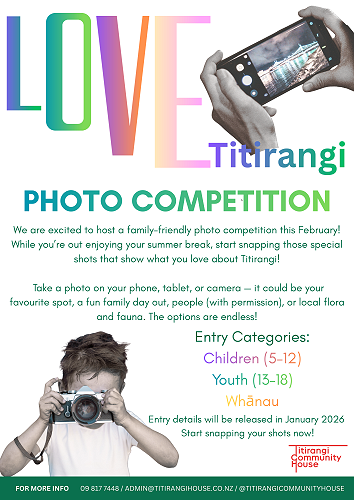 Snap your favourite spots, fun family moments, local wildlife, or anything you love about Titirangi. Entry details will be released in January 2026 — start taking your photos now!