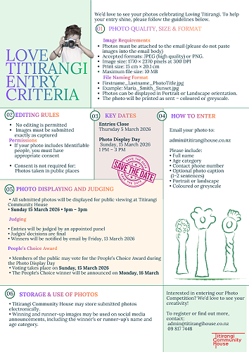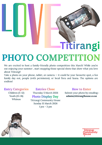 We would love to invite you and your whānau to take part in the Love Titirangi Photo Competition 2026. Many young people enjoy taking photos, and this is a great chance for them to share their creativity with the community. If you live in Titirangi, we would especially love you to join.