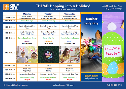 If you need child care for the half day on Wednesday 25th March or teacher only day on Thursday 2nd April book in at Kelly Club now.