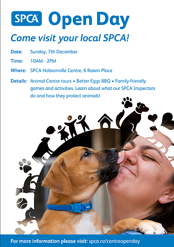 Come visit the SPCA on Sunday 7 December, 10am - 2pm.SPCA Hobsonville Centre, 6 Rawiri Place.
