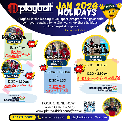Playball workshops in New Lynn, Te Atatu Peninsula and Kelston Comunity Centres over January.
