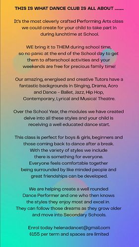 45 minute fun filled dance session. These classes are designed to cater for the "Busy Parent" to allow their child to get their regular Dance Class done during School Hours! These classes are designed for all ages and abilities, Boys and Girls and they are not exam orientated. Forward their Name, Address, Telephone to helenadancet@gmail.com and we will have your child up and dancing in no time at all!