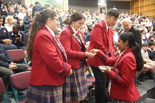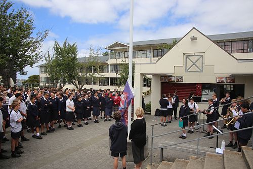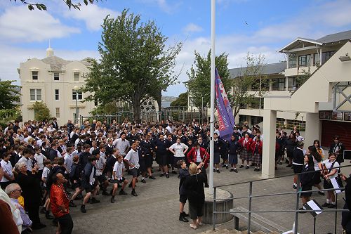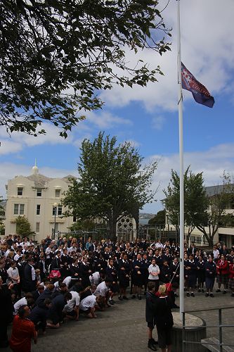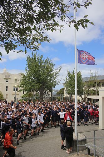 Students and staff then moved to the flagpole for the final blessing, haka, and singing of the Kavanagh School Song. While the haka was performed, our long serving staff member and stalwart of the office, Maria Menzies, along with Year 7 student, Ezra Bennett, who is the grandson of Malcolm Farry (the first Board Chair of Kavanagh College), lowered the Kavanagh College flag for the final time.