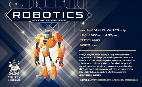 Programme details: Dates: Monday 25 - Wednesday 27 July 2022 Time: 9:00am - 4:00pm Cost: $350 The programme is open to students from Year 6 and up. No previous experience necessary, other than an enthusiasm and interest in robotics. Students must bring a Windows or Apple laptop. Please bring a packed lunch, snacks and water. Lunch options are available for $10 per day. To book and pay, please register on the Whitby Collegiate website's holiday programme page https://www.whitbycollegiate.school.nz/ or via the following link:https://form.jotform.com/whitbyenrol/robotics-ai-holiday-programme