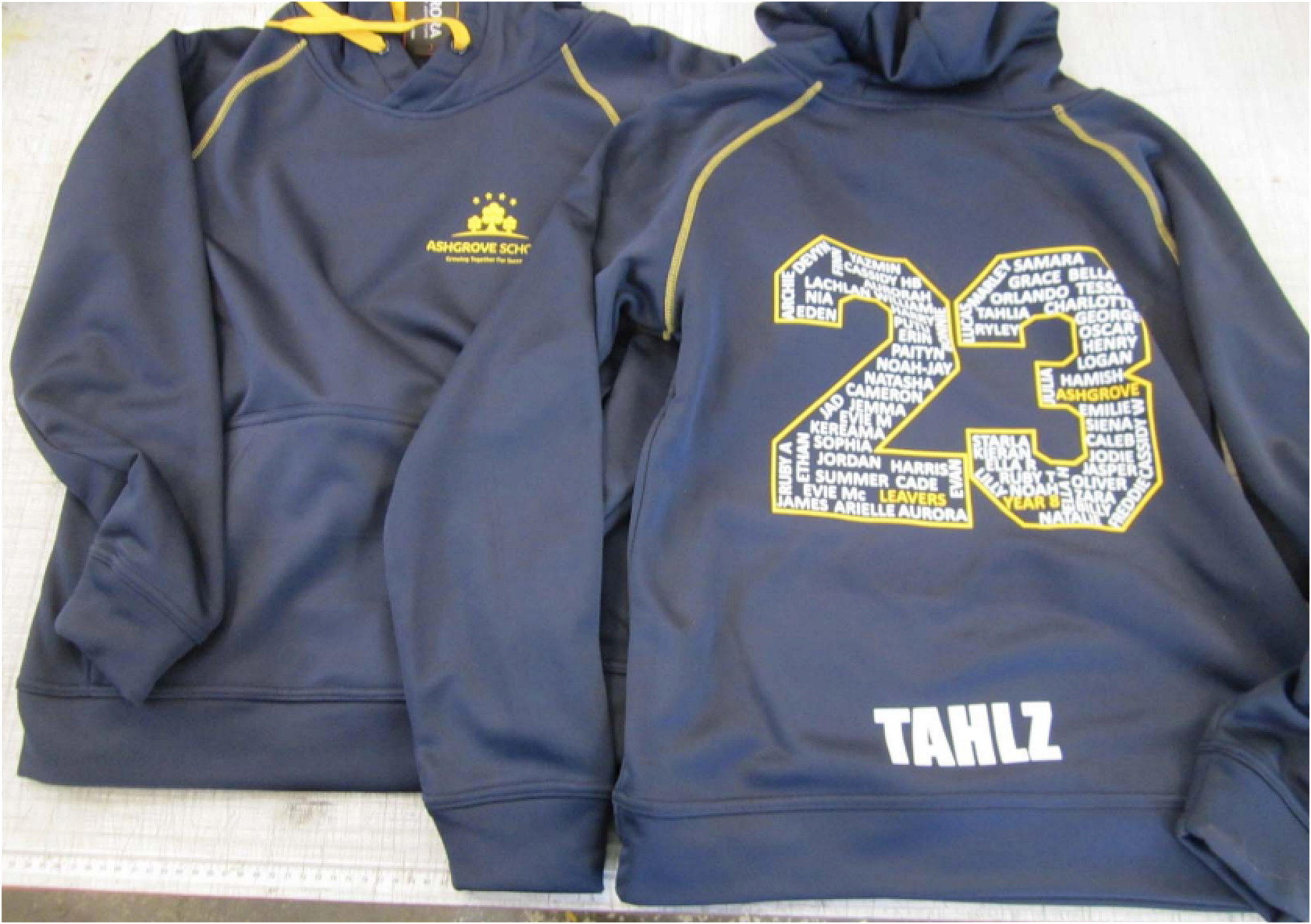 The XT Performance Hoodies are made from 270gsm polyester performance fabric, are brushed inside for comfort, have a contrast hood lining, drawcord, and stitching detail, raglan sleeve, have cord management for music player and are quick drying and very colourfast. The hoodie will have the Ashgrove logo on the front and a large ‘25’ with all the Year 8 names on the back. Students can also have their name printed on the lower back.