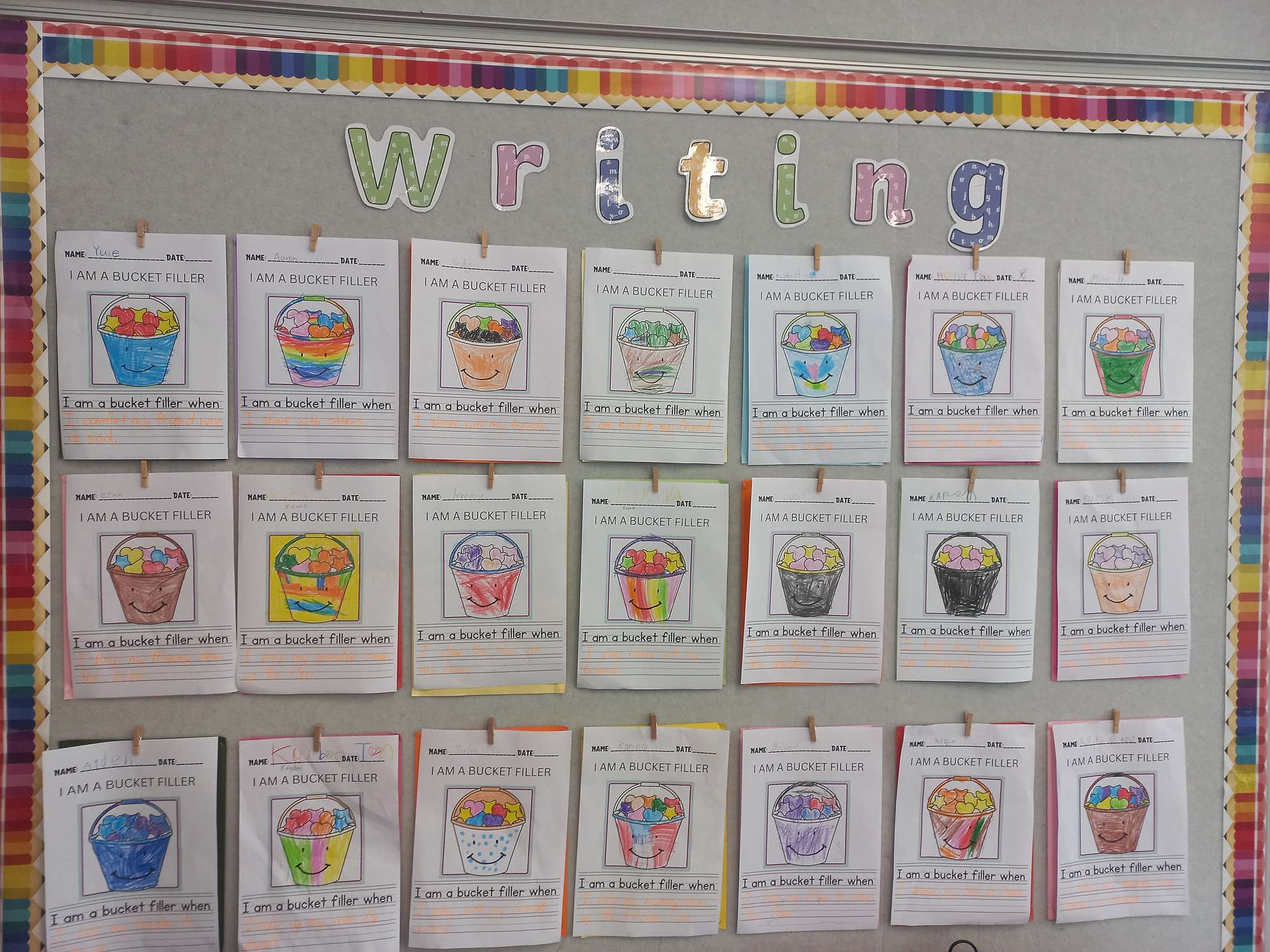 Room 19 talked about what “Bucket Filling” choices are and shared their ideas together for their writing. Room 15 read the story “Have You Filled a Bucket Today?” and completed a sorting activity to understand the difference between bucket filling and bucket dipping. They’ve all been amazing bucket fillers!