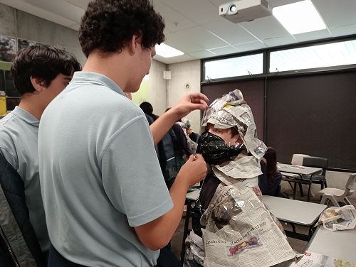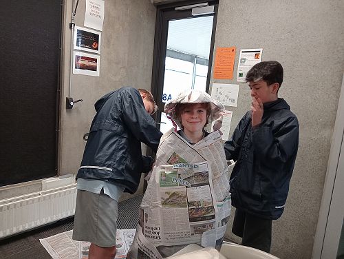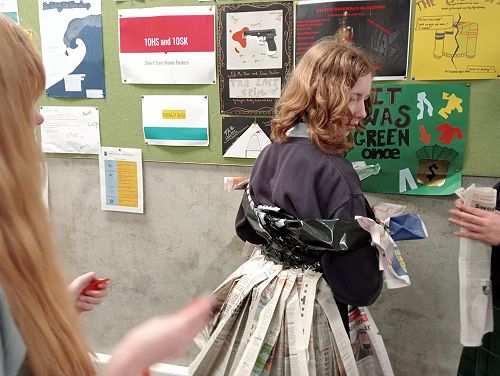 9NV have been studying the film Cruella in English this term. As Cruella is a story about fashion, and turning rags into riches, 9NV were given the task to create a fantastic outfit using only a rubbish bag, newspaper, and a recyclable shopping bag. Students Luca Fono and Isla Jeffrey give us a first hand account of their group's work.