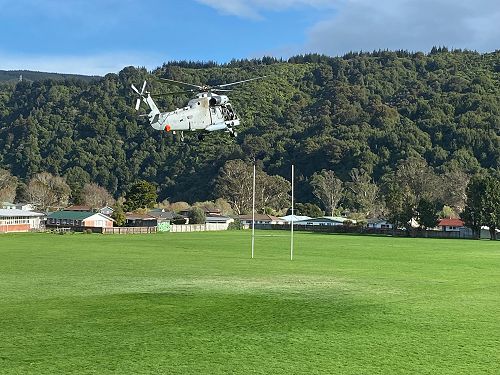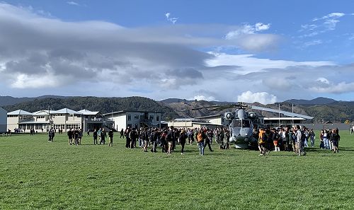 Despite the Friday late start, a large number of students and staff gathered on the perimeter of the field, eagerly awaiting the helicopters. When we heard them approaching, and saw them appearing in the distance, there was a real sense of excitement in the crowd, which had grown in numbers with the addition of Fergusson Intermediate students, neighbours and passers-by, and even the father of one of the helicopter pilots.