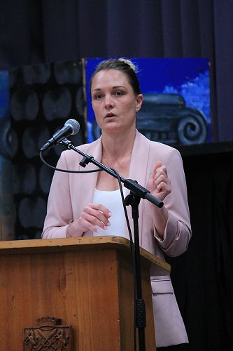 In a full school hall, students and whānau listened to guest speaker and CEO of the Special Olympics New Zealand & former netball executive Fran Scholey.
