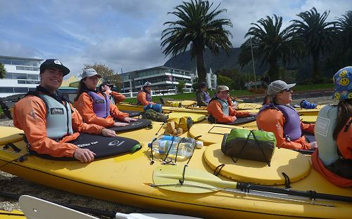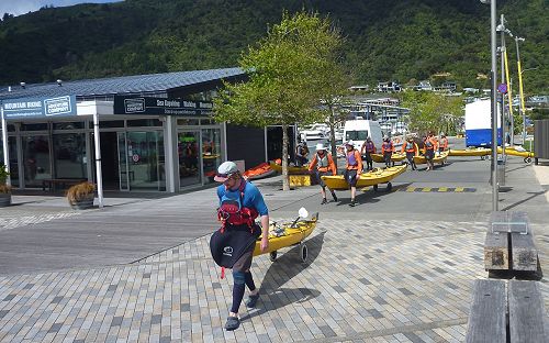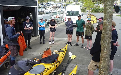 After arriving in Picton, we met our amazing guides, George and Andy, who would be joining us for the next three days. They took us through everything we needed to know for the trip. We loaded all our gear into the kayaks in waterproof bags and got dressed into some bright orange spray jackets along with a lifejacket and spray skirt. After that we wheeled the boats over to the water, then lifted them onto the beach in teams of four. We learnt how to adjust the seats and rudder foot pedals, use our spray skirts and also learnt how to get them off in the event that we capsized. Thankfully this was covered.