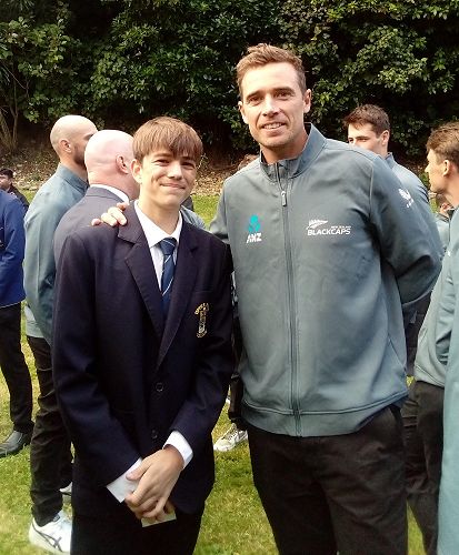 Max is pictured in the main photo with fast bowler Matt Henry and legendary batter Kane Williamson. In the second photo Max is pictured with one of New Zealand's best ever bowlers Tim Southee.
