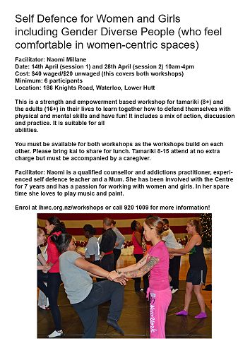 Tamariki aged 8-15 attend at no extra charge but must be accompanied by a caregiver.You can find more information/sign ups here: Self Defence for Women and Girls including Gender Diverse People (who feel comfortable in women-centric spaces) - Lower Hutt Women's Centre (lhwc.org.nz)