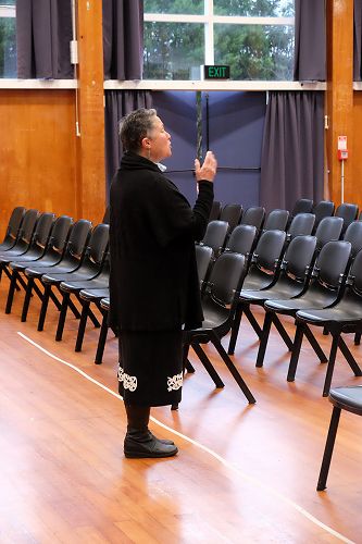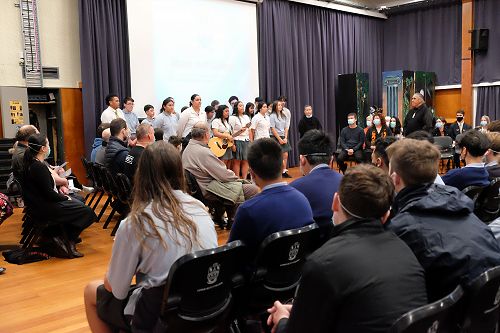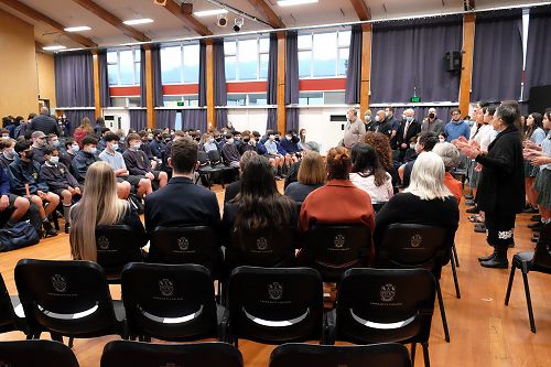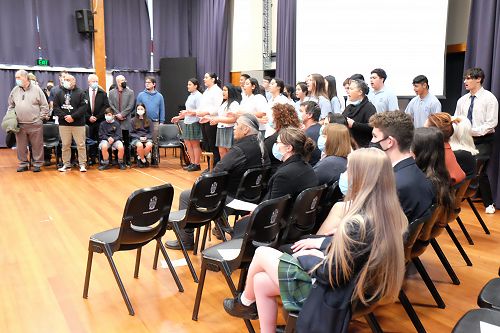 After that whaikōrero (speeches) were said then it was time to guide the manuhiri (guests) to the side of the tangata whenua (natives). That's when two Year 13 student leaders guided two Year 9's to the tangata whenua side.