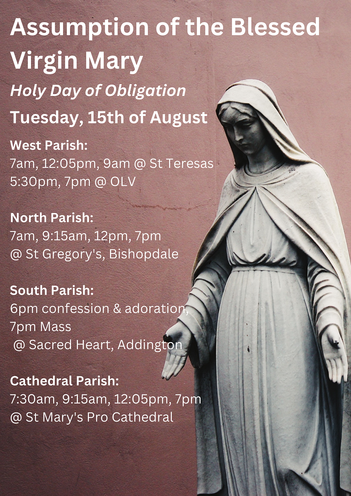 This Tuesday, 15th of August, we celebrate the Feast of the Assumption. The Feast of the Assumption of Mary is one of the few Holy Days of Obligation in New Zealand, where the Catholic church requires all Catholics to attend Mass throughout the day.