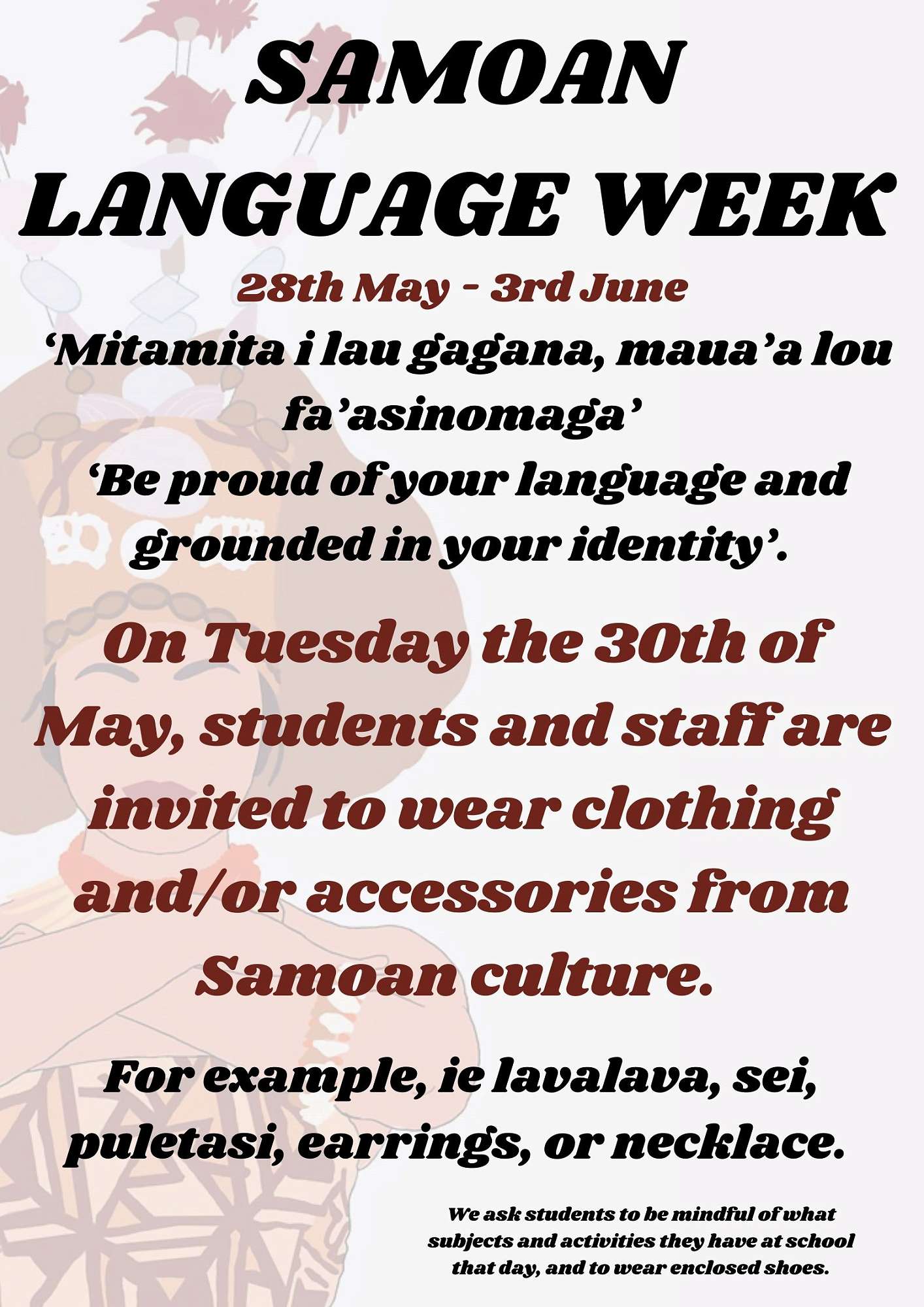 · Students and staff invited to wear clothing and/or accessories from Samoan culture. For example, ie lavalava, sei, puletasi, earrings, or necklace. We ask students to be mindful of what subjects and activities they have at school that day, and to wear enclosed shoes.