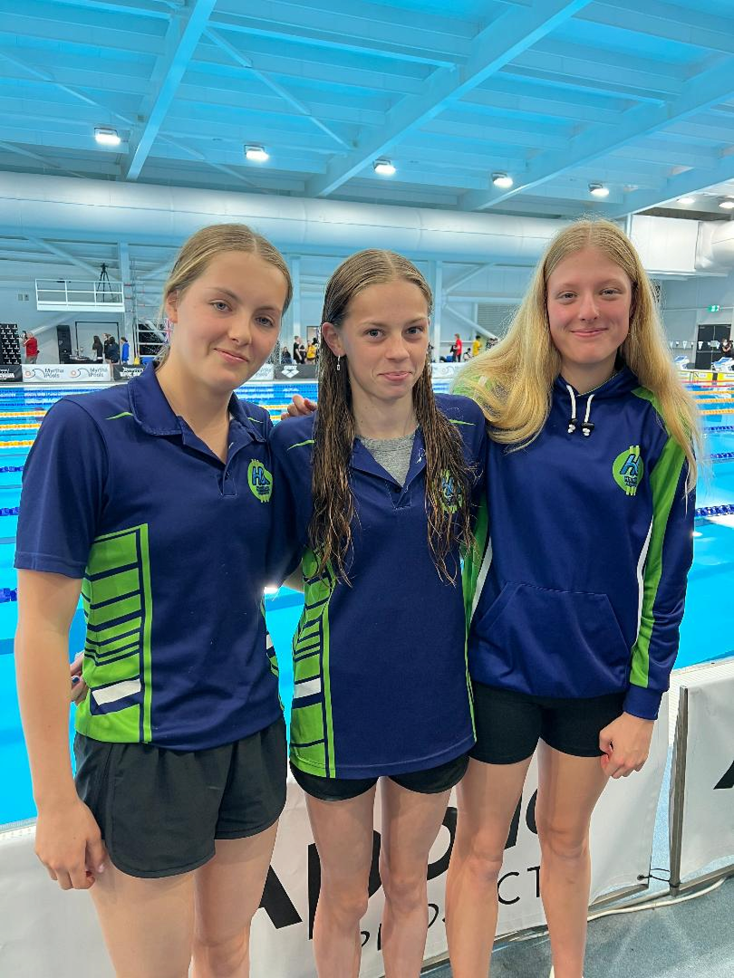 Sophie Hay, Paige Stringer, and Ariella Riley at the Swimming New Zealand National Age Championships. Hayley McIntyre was absent from the photo. — Image by: Deahnn Tinsley