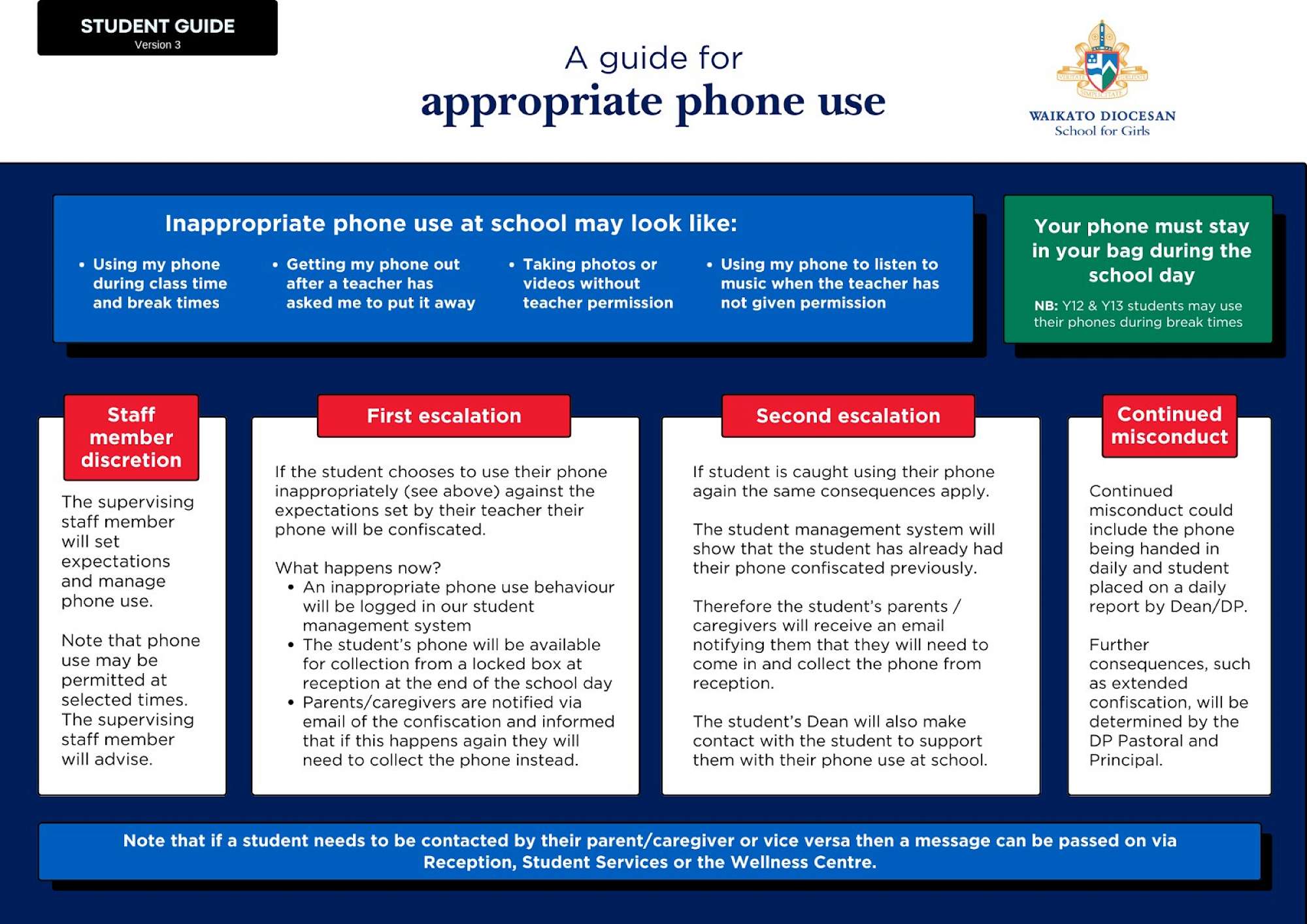 Years 12 and 13 students can use their phones during breaks and at the discretion of a staff member. Cell phones must be turned off during form class, scheduled class periods, study periods, chapel and assemblies. If a student chooses to breach the cell phone policy, their cell phone may be confiscated.