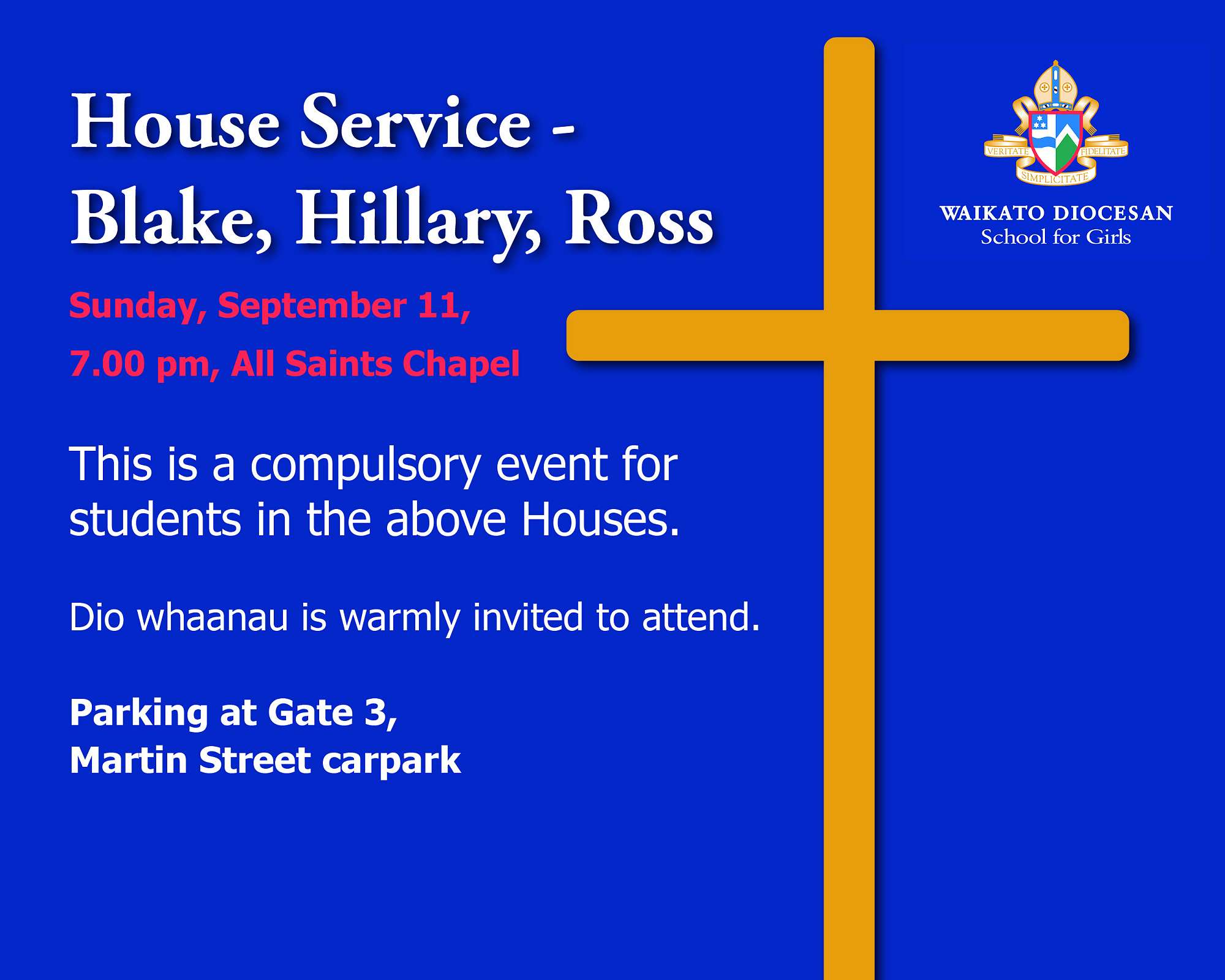 • Sunday 11 September - House Service (Blake, Hillary, Ross), 7.00 pm, All Saints Chapel. Uniforms to be worn.