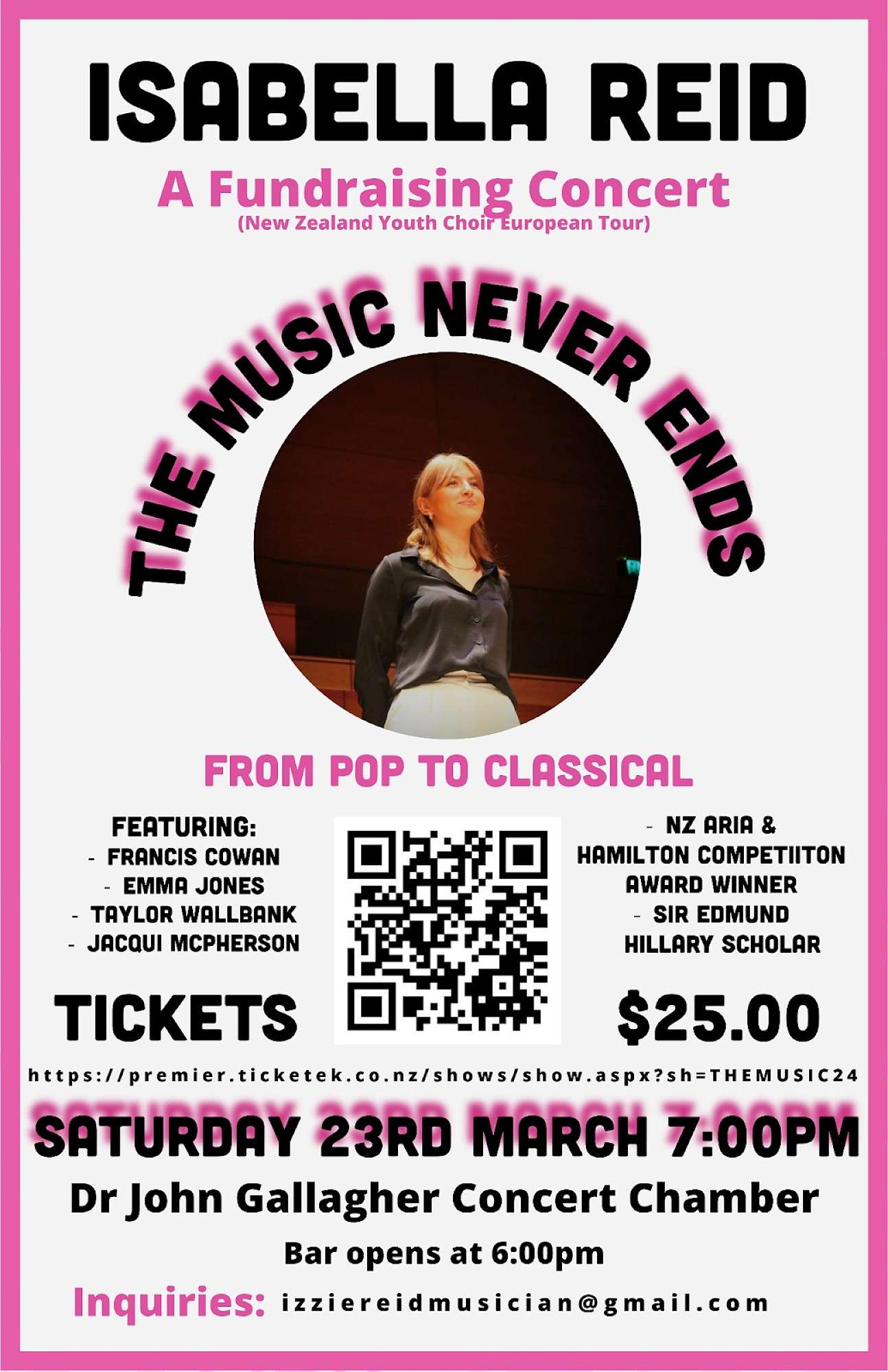 Dio Old Girl and past Arts Laureate Isabella Reid is having a fundraising concert for her upcoming European tour with the New Zealand Youth Choir. 23 March 2024 at 7:00 pm at the Gallagher Concert Chamber at the University of Waikato, and she would love some Dio support