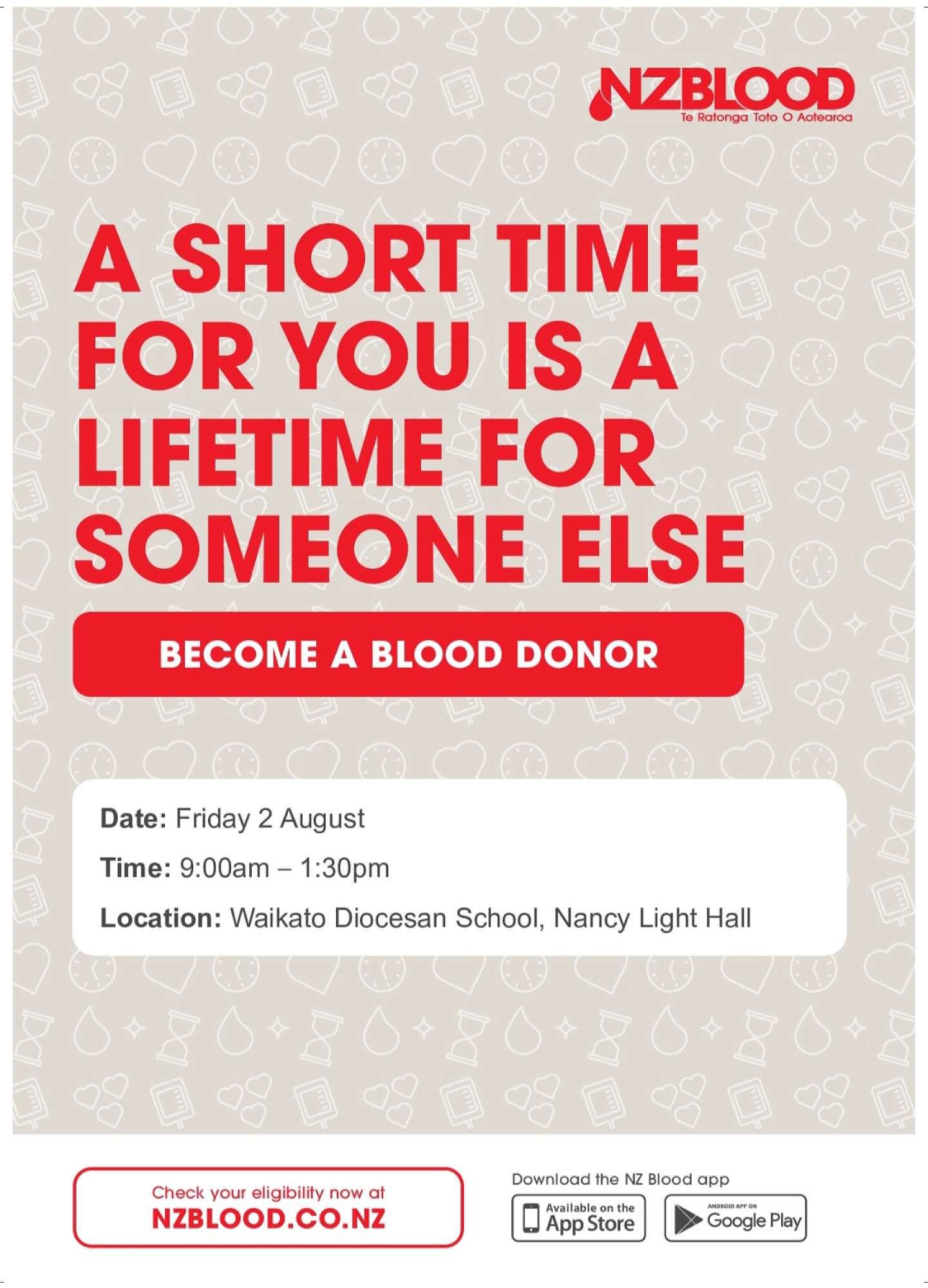 NZBS recommends that students discuss becoming blood donors with their families. If families have a particular objection to the student donating blood, please inform the student and the school before the blood drive date stated above. More information about blood donation will be available on the day of the blood drive.