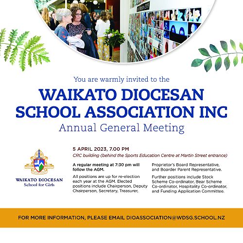 On Wednesday, 5 April, at 7.00 pm in the CRC building, we will hold our AGM. We will call for elected positions to be nominated, and voted for. Positions include Chairperson, Deputy Chairperson, Treasurer, Secretary, Proprietor's Board Rep, Boarding Rep, and Staff Rep. There is also our Stock Scheme, Dio Bears, Application funding and Hospitality teams. Some of these positions have incumbents standing again. We have also set up a meeting platform for those who want to join via Zoom: